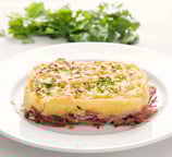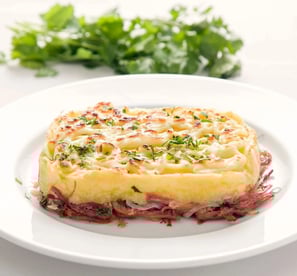 Em um refratário, coloque a carne seca e cubra com o purê. Finalize com queijo e leve ao forno para gratinar.