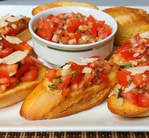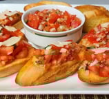Ingredientes: Fatias de pão italiano, tomate picado, manjericão fresco, azeite e alho.