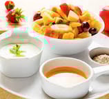 Ingredientes: Frutas variadas (morangos, uvas, banana, kiwi), iogurte natural e mel.