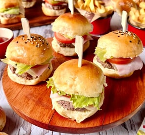 Ingredientes: Pães pequenos, carne moída temperada, queijo, alface, tomate e molho especial.