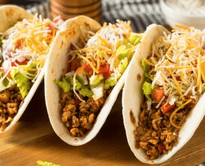 Ingredientes: Tortilhas, carne moída temperada, queijo ralado, alface e molho de tomate.