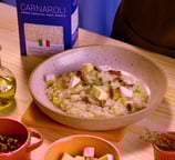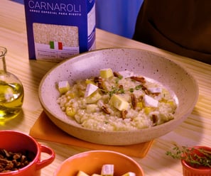 Prepare o risoto da maneira tradicional, incorporando o parmesão ao final. Decore com as nozes e os damascos para um toque natalino.